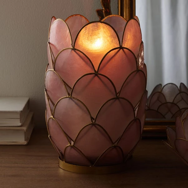 Enhance your decor with a touch of elegance, with this exquisite Capiz Pink Hurricane Candle Holder. Beautifully made from pearlized Capiz shell, this tealight holder features an elegant flower inspired design with gold painted details, the perfect statement piece for any home.