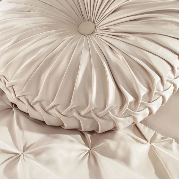 Add texture and a touch of classic style to your decor with this beautiful round ruched cushion, filled with soft hollowfibre and finished in an elegant shade of champagne it adds sophistication to your bed linen.
