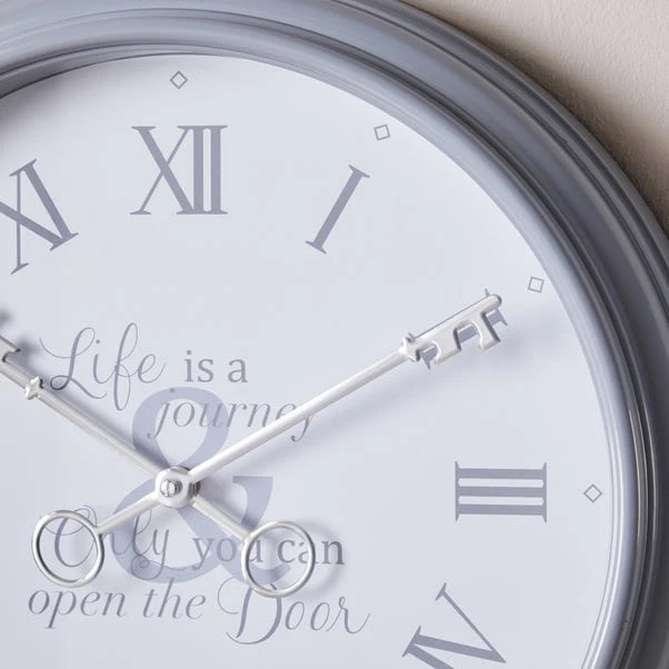 Update your walls with this stylish, grey clock. Designed with an inspiring and uplifting quote in the middle, this clock features interesting key shaped hands with a 12-hour display and easy to read roman numerals, perfect for adding the finishing touch to a range of rooms.