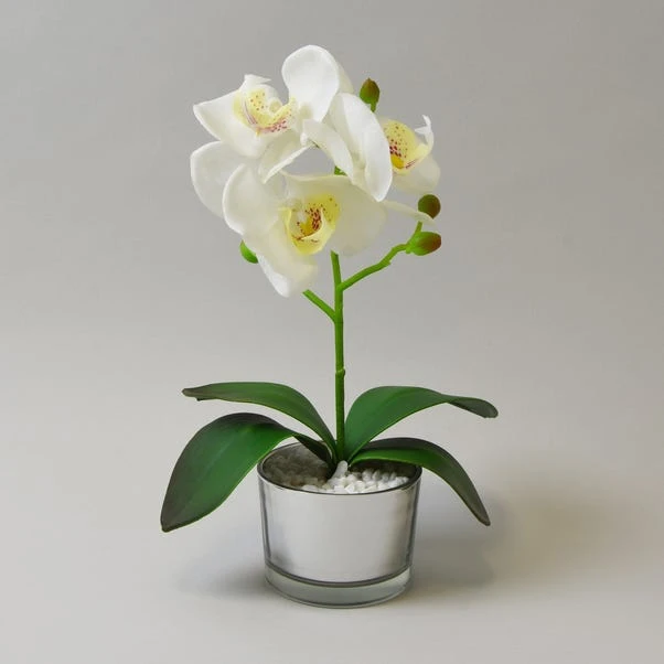 Perfect for adding a little tranquility to your home, this stunning artificial white Orchid boasts a realistic design and requires no maintenance. Complete with a silver coloured glass pot, this product is perfect for livening up any room in your home.