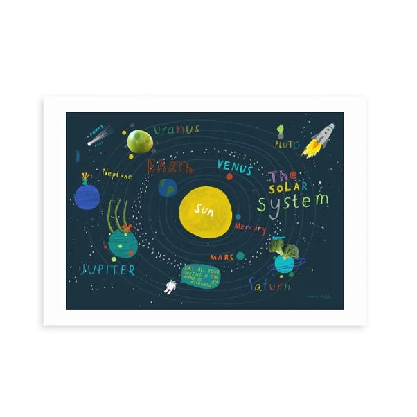 Give your little astronaut the motivation they need to eat their greens with this awesome artwork by Hanna Melin. Featuring a space theme of planets, rockets, aliens and of course plenty of vegetables, this print will sit well in any kitchen or bedroom space with the perfect subtle reminder to love your sprouts and broccoli. This print is made to last as it uses a Giclee printing process to stay vibrant and prevent fading over years. Each design is available in four print sizes and a variety of frame options, including unframed, so you can display your artwork however you wish.
