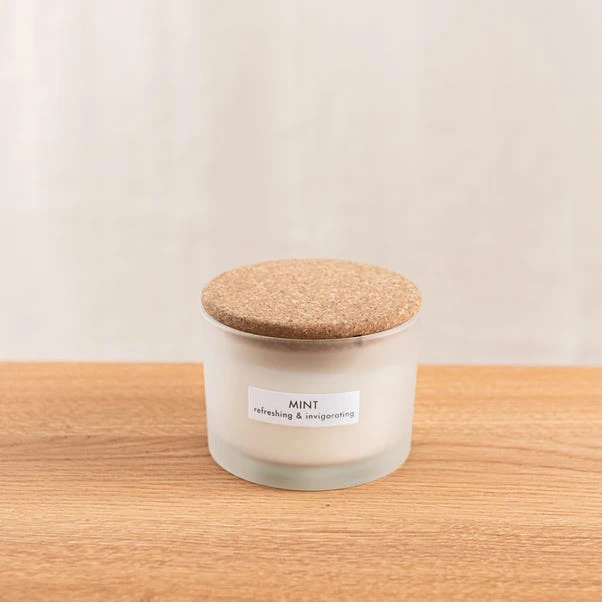 When you’re craving a calming moment, try lighting a candle. The gentle flicker of the flame, soft illumination and beautiful scent can be wonderfully soothing. Feel refreshed and invigorated by the sweet and astringent scented oil of mint, with this blended wax using soybeans; soy wax blends produce a high level of fragrance performance. Designed with 3 wicks, frosted glass and a cork lid, this candle has a burn time of up to 35 hours.